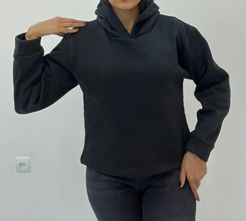 هودی مشکی دخترانه ،جنس سه نخ متوسط (گرم ،نرم و مناسب پاییز و زمستان) یقه ساده و کلاه دار بدون زیپ  قد ۶۰تا۶۵ ( روی باسن قرار میگیردسایز۳۶تا۴6